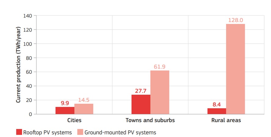 En las zonas rurales, la mayor parte de la energía se produce en sistemas fotovoltaicos enclavados en terrenos y suelos, mientras que solo un 8% se generan a partir de sistemas fotovoltaicos en tejados, una cifra que se pretende aumentar con el impulso de Comunidades Energéticas, ya que actualmente se está promoviendo la instalación de la infraestructura necesaria en los tejados de grandes techumbres como polideportivos o naves industriales (de ahí surge el trabajo de las distintas Oficinas de Transformación Comunitaria en el país).